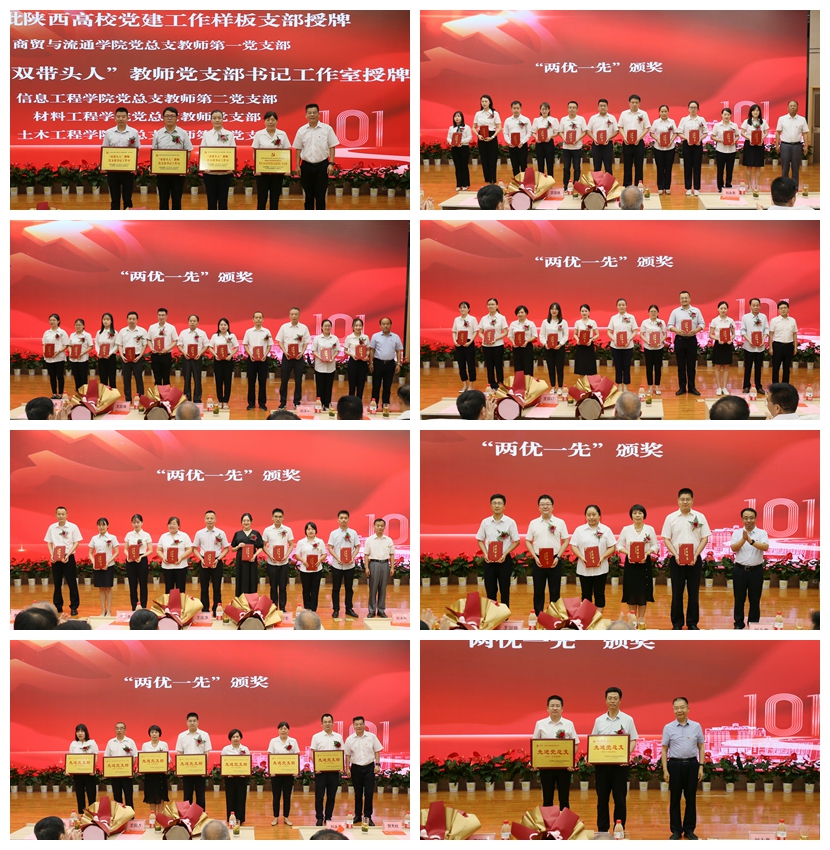 在党委副书记贺天柱宣读陕西省委教育工委第二批新时代党建“双创”工作创建单位验收结果,第三批陕西高校党建示范高校、标杆院系、样板支部培育创建名单,首批校级“双带头人”教师党支部书记工作室建设名单以及2021-2022学年学校“两优一先”表彰决定后,与会领导为获奖集体和个人颁奖,共同见证他们的荣耀时刻。