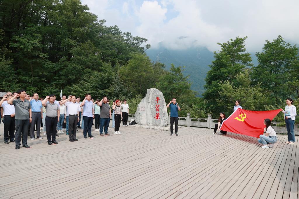 在月亮垭观景台现场教学点,全体人员面向党旗,庄严宣誓,重温入党誓词