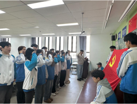 最后,在支部教师党员高壮壮的带领下,全体党员高举右拳,面对鲜红的党旗,重温入党誓词。宣誓声响彻会场,字字铿锵、句句有力,让全体党员接受了一次思想上的再教育、心灵上的再洗礼,有效增强了党员的归属感、荣誉感和使命感,也让仪式感的外在形式转化为党员党性意识的自觉提升。